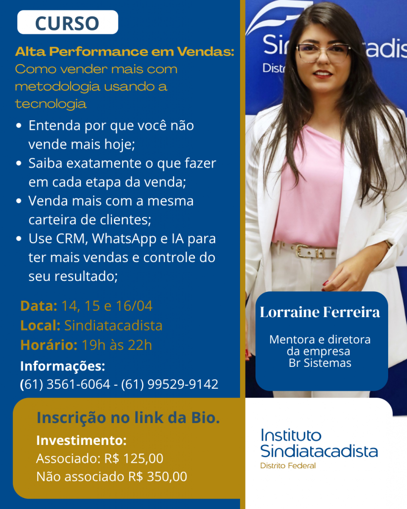 O Curso será ministrado pela mentora e diretora da empresa Br Sistemas, Lorraine Ferreira. Com mais de 20 anos de experiência no mercado corporativo, com foco na evolução do setor comercial. Graduada em Processos Gerenciais, cursos: Inteligência Artificial na prática para as vendas, Gestão de conflitos, Linguagem corporal, possui MBA em vendas, persuasão, negociação e alta performance e é Analista em comportamento humano, temperamentos, bloqueios emocionais e inteligência emocional.